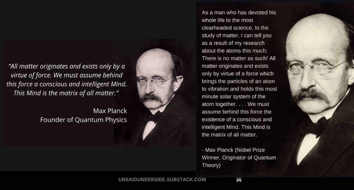 âAll matter originates and exists only by virtue of a force which brings the particle of an atom to vibration and holds this most minute solar system of the atom together. We must assume behind this force the existence of a conscious and intelligent mind. This mind is the matrix of all matter.â