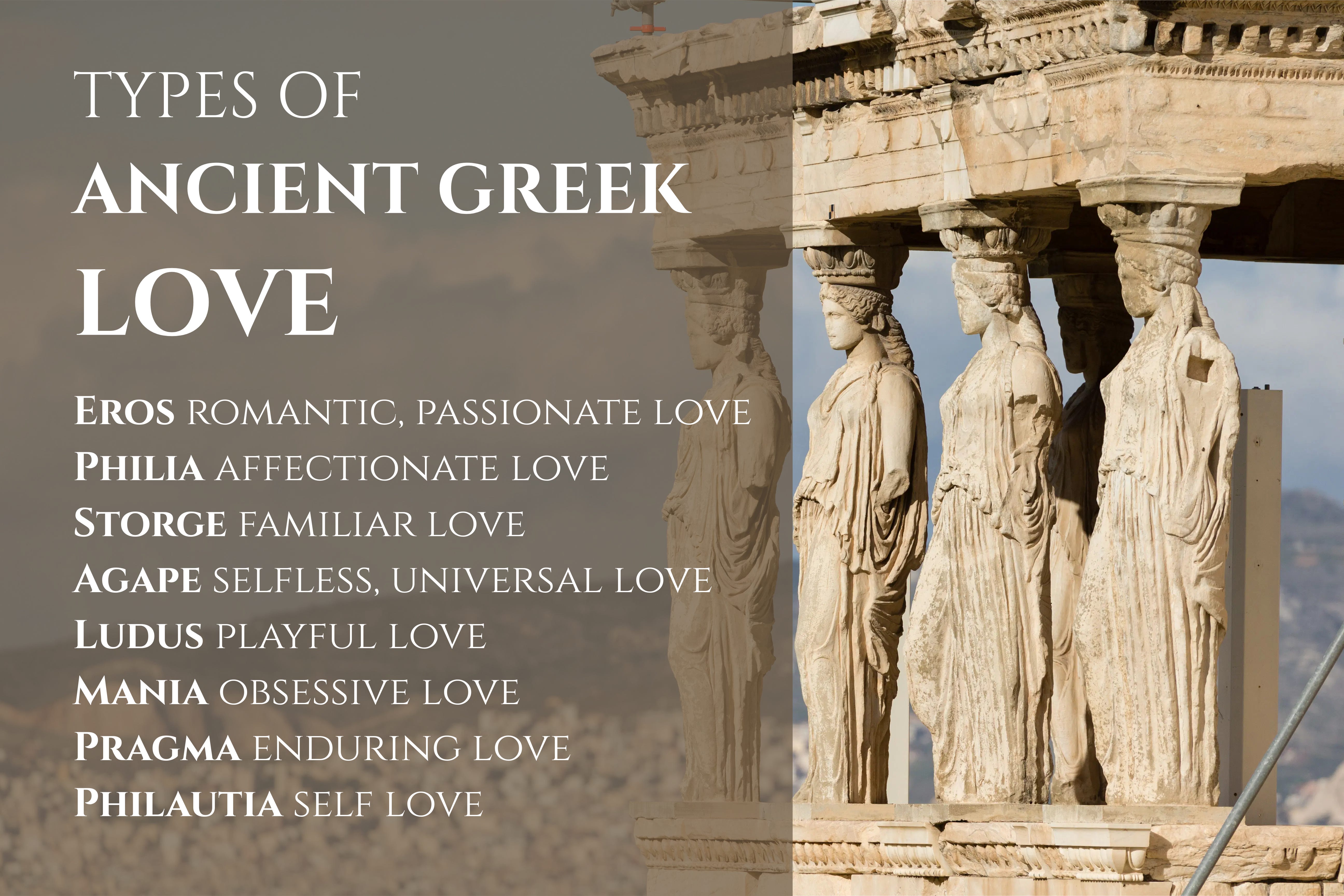 We only have one word for all existing forms of love today in the English (American) culture. However, there is no single word in Ancient Greek that captures all the types of love the way we might try to use “love” in English.