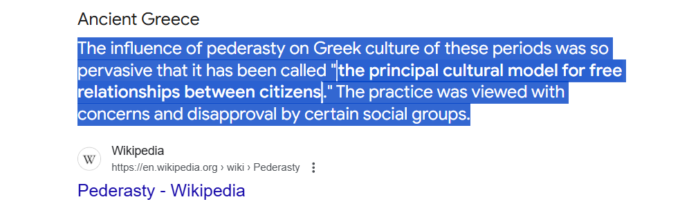 Pedophilia goes back to Ancient Greece too — this was a popular practice which the Ancient Romans also embraced. And it’s said that not everyone practiced it but certainly over 10% of Greco-Roman societies, especially at the elite levels.