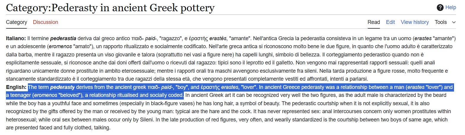I had no intention of writing about pedophilia again! But as I was writing about the various forms of Greek Love it dawned on me what they used to practice. Again, it's not new to me but the insight that it was also systemic became that much more sobering.